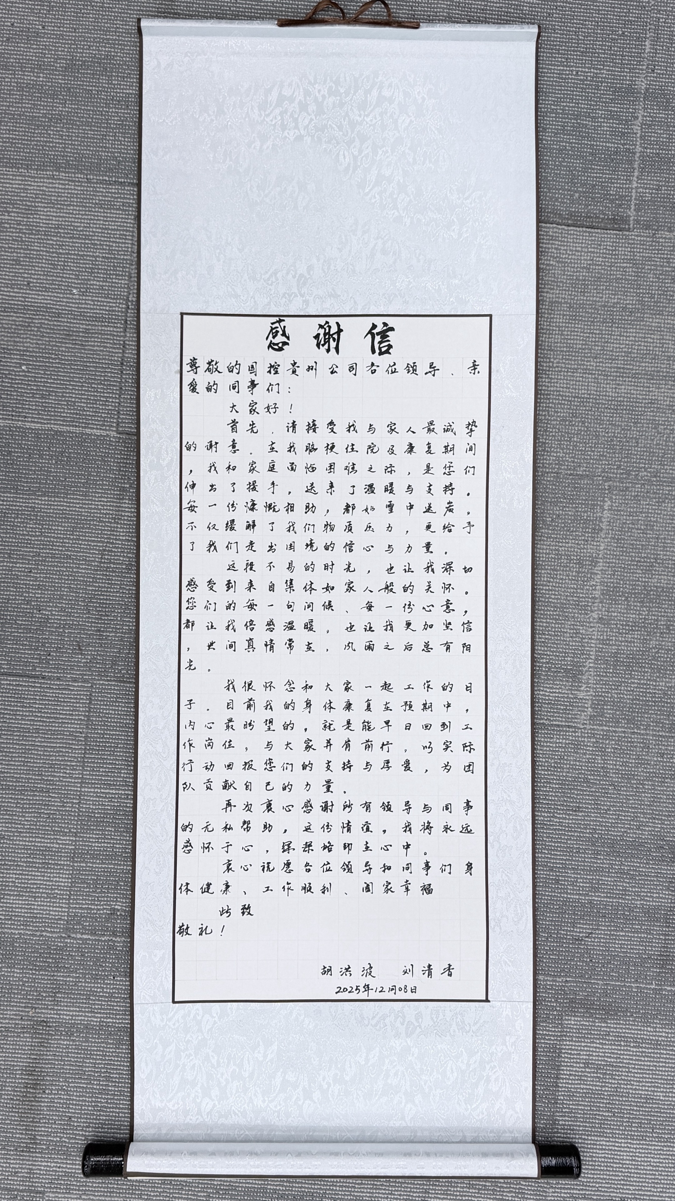 “公司的暖心慰问、熊经理翻墙时磨破的掌心,舒大哥签字时颤抖的手,还有大家日夜不休的守护,我们全家都记在心里。”当老胡的妻子双手捧着感谢信,深深鞠躬的那一刻,周围的掌声久久不息。信纸上的字迹有些颤抖,却字字千钧:“是你们用勇气推开了生命之门,用陪伴照亮了康复之路,这恩情我们永世不忘。”