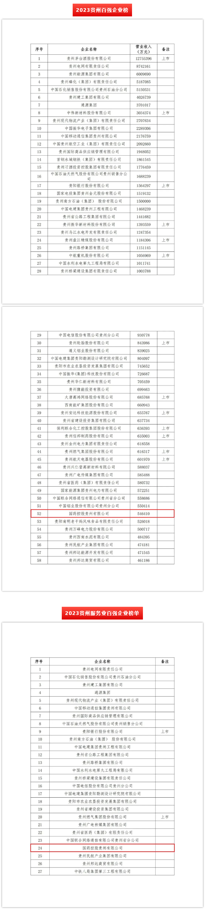2023年12月28日,由中国企业联合会、中国企业家协会指导,贵州省企业联合会、贵州省企业家协会(简称贵州省企联)主办的2023贵州百强企业、2022-2023年度贵州省优秀企业暨第23届贵州省企业管理创新成果发布会在贵阳召开。国控贵州位居2023年“贵州省百强企业”第52强、“贵州省百强服务业”24位。