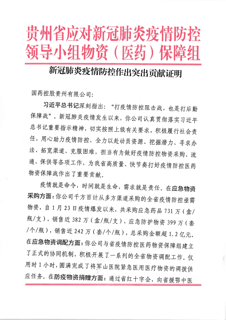 公司再获贵州省应对新冠肺炎疫情防控领导小组物资(医药)保障组表彰,获得突出贡献证明!