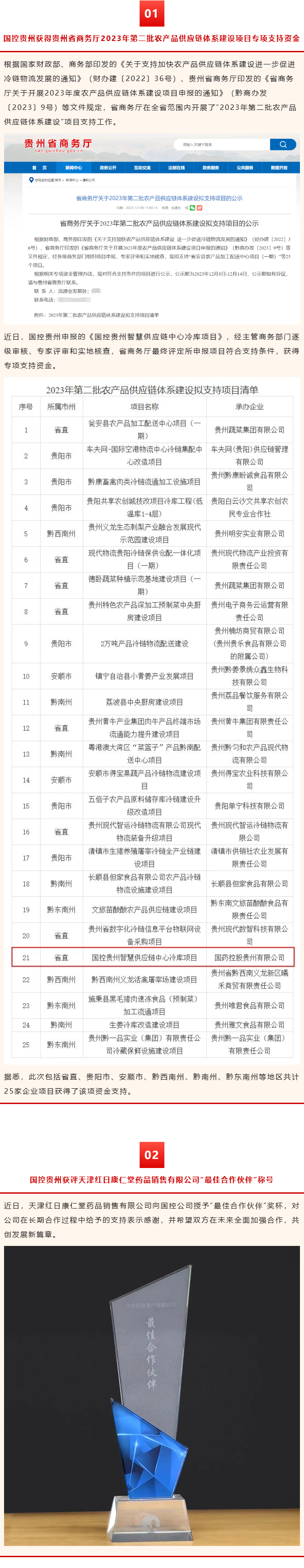 国控贵州获得贵州省商务厅2023年第二批农产品供应链体系建设项目专项支持资金以及上游供应商“最佳合作伙伴”称号