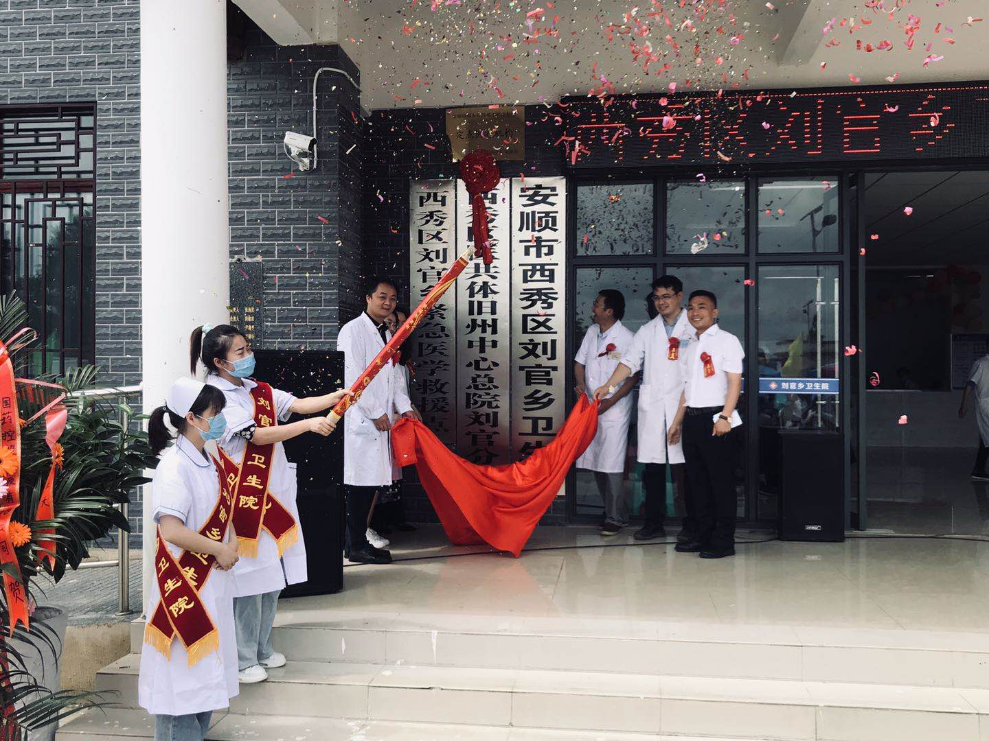 安顺市中医院副院长朱波、西秀区医管办主任、区卫生健康局局长缪琳、西秀区人民医院副院长章立、西秀区人民医院副院长曾国波、旧州中心总院院长罗凌峰、青岛市北区援黔医疗专家张珊等共同为旧州中心总院刘官分院揭牌,一个崭新面貌的刘官卫生院诞生了。