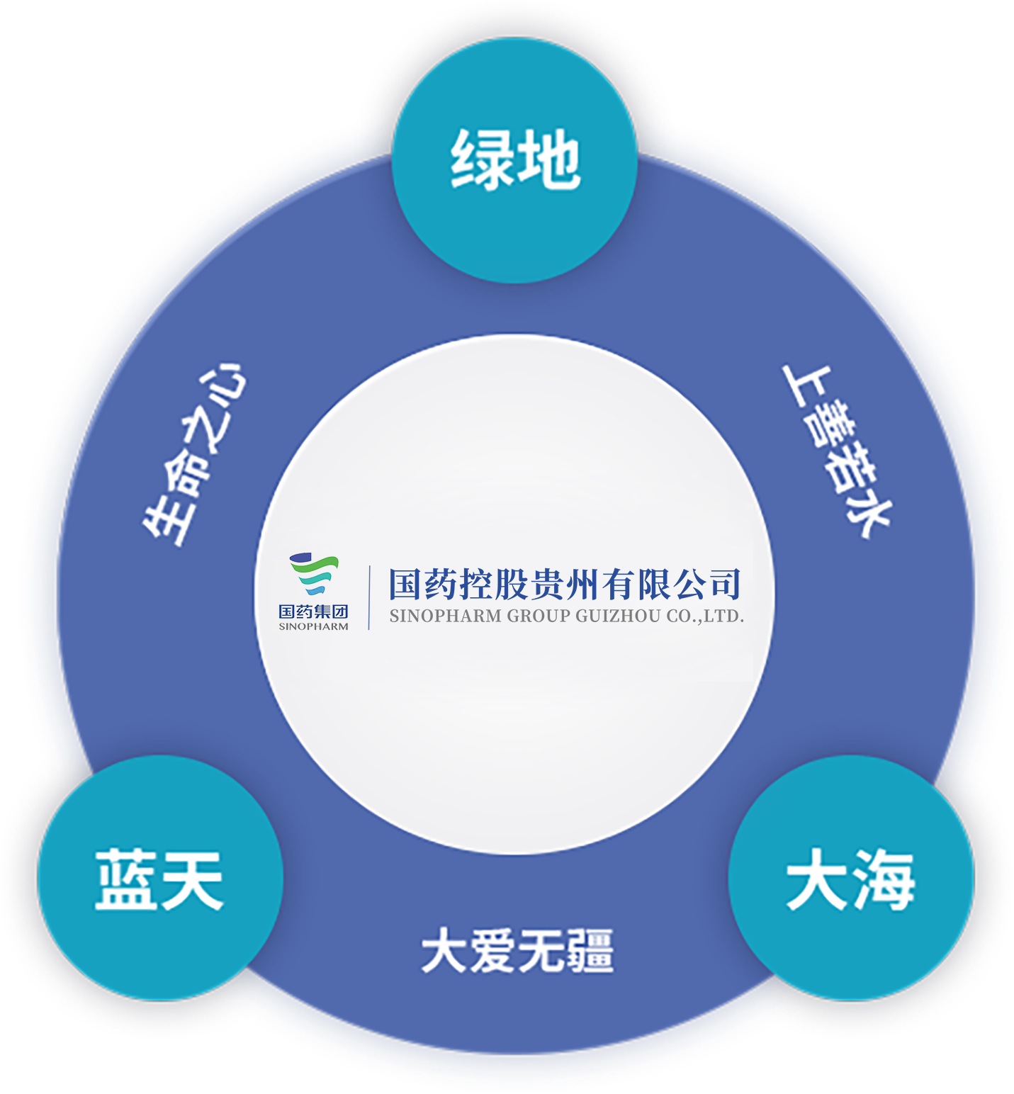 绿色、蓝色、湖蓝色相匹配,将绿地、蓝天、大海有机融合,寓意国药集团商贸、科研、工业三大体系协同共荣。